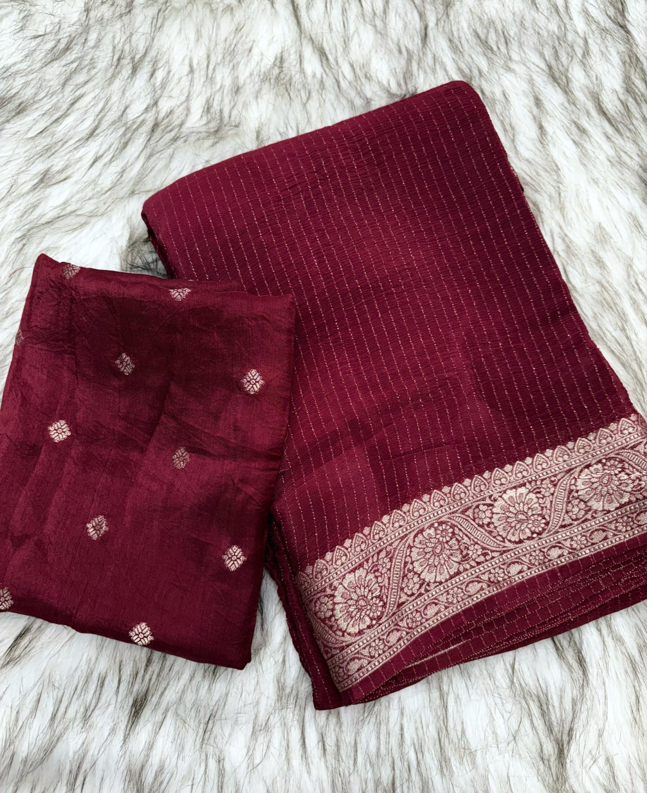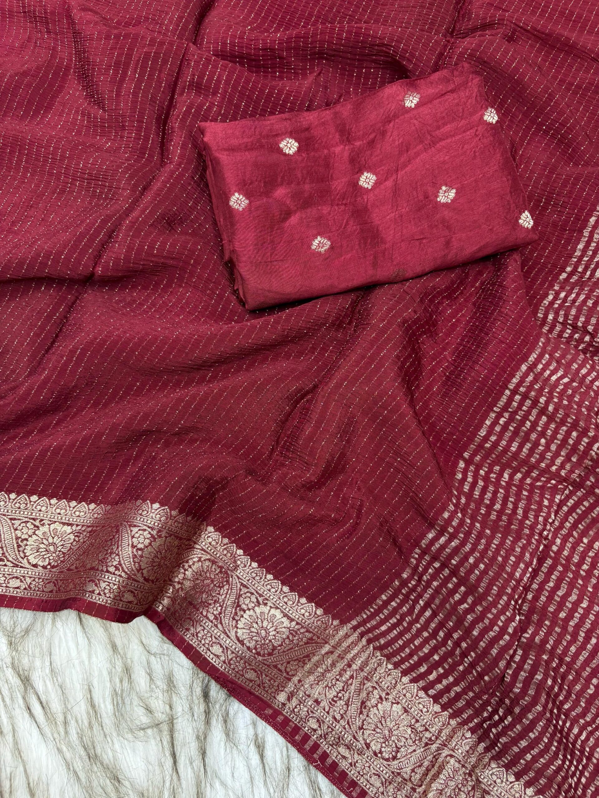 Pure viscose Chinon silk saree with lurex zari in the body and a jacquard weave border with a matching viscose zari butti blouse.