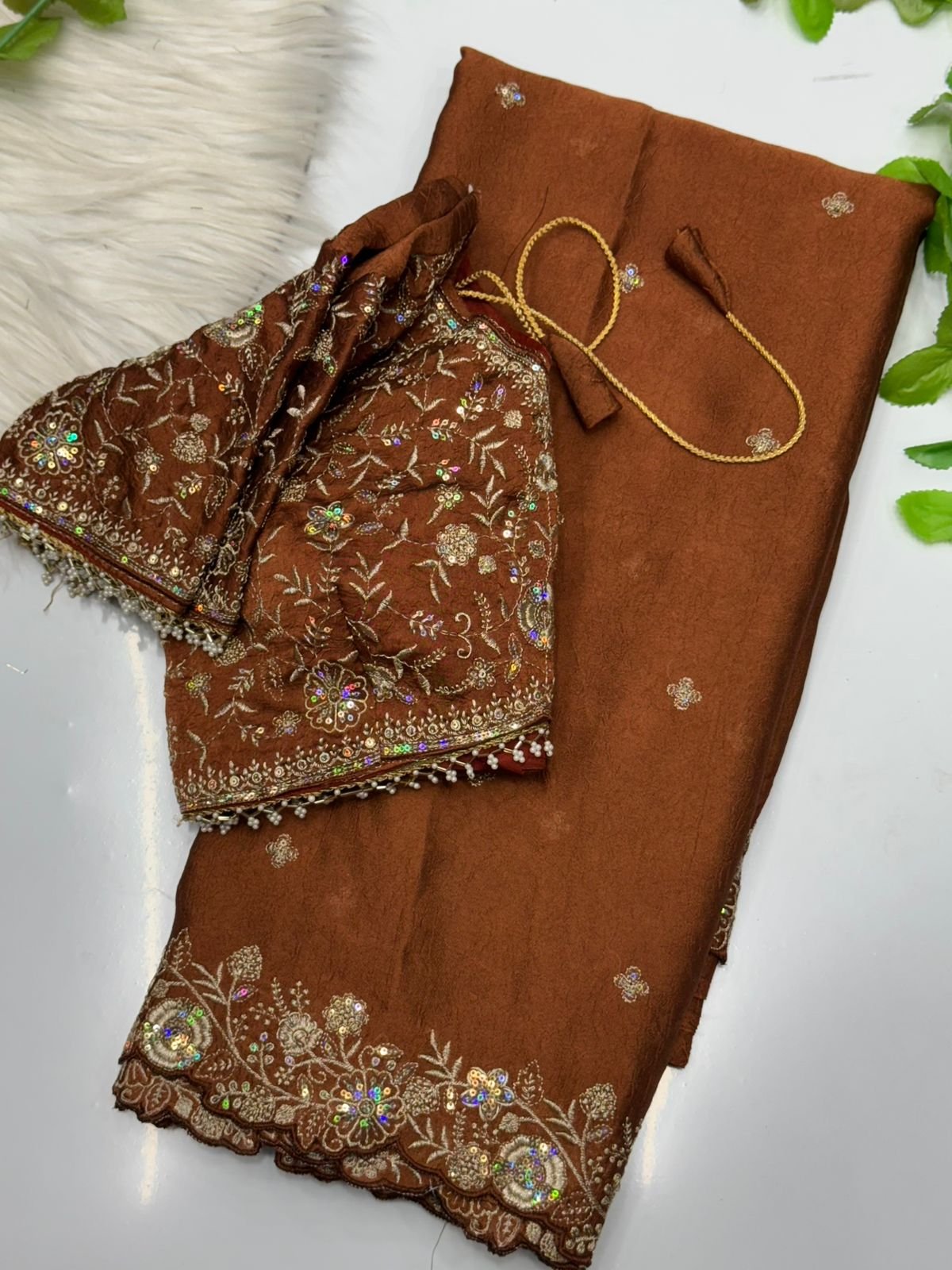 soft rangoli crush blouse fabric with embroidery sequins and jari work with front and sleeves work