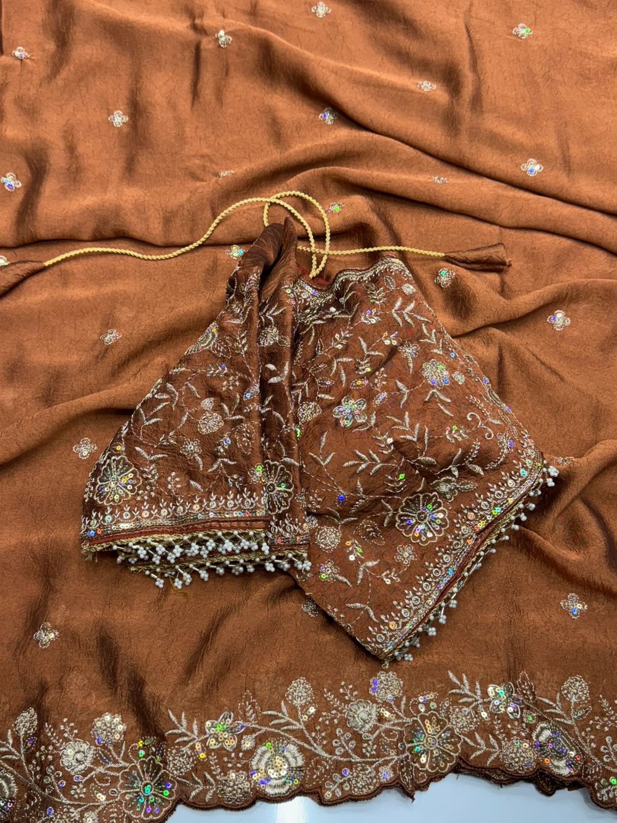 soft rangoli crush saree fabric with embroidery sequins and jari work with scallop border
