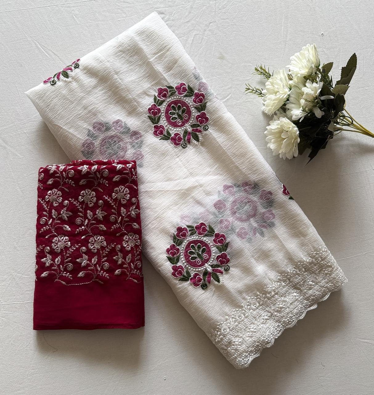 👉🏻🥻 Pure crush Georgette chiffon saree with premium floral embroidery all over the saree with scallop embroidery border