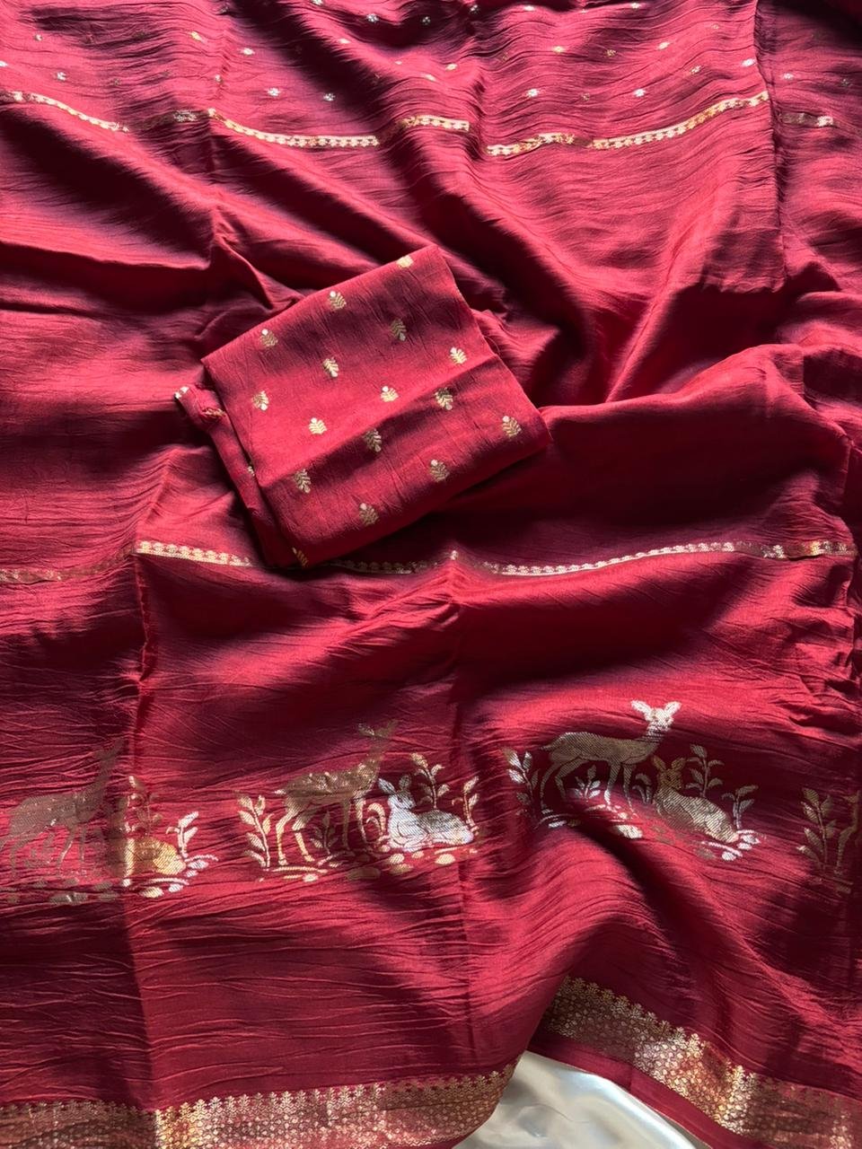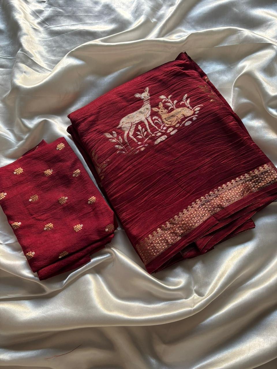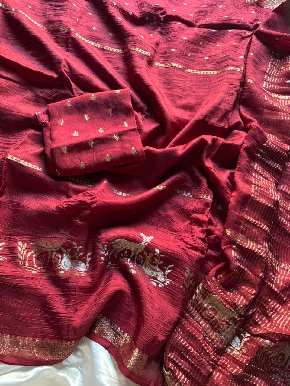 Embrace the elegance of our Pure Russian Khadi Viscose Saree, adorned with intricate Hiran (Deer) figures and stunning 2-type Zari Jacquard Patta. Paired with a beautiful Russian Butti blouse, this saree is a true masterpiece. 🦌✨ #ViscoseSaree #KhadiSaree #RussianKhadi #HiranSaree #ZariJacquard #ElegantSaree