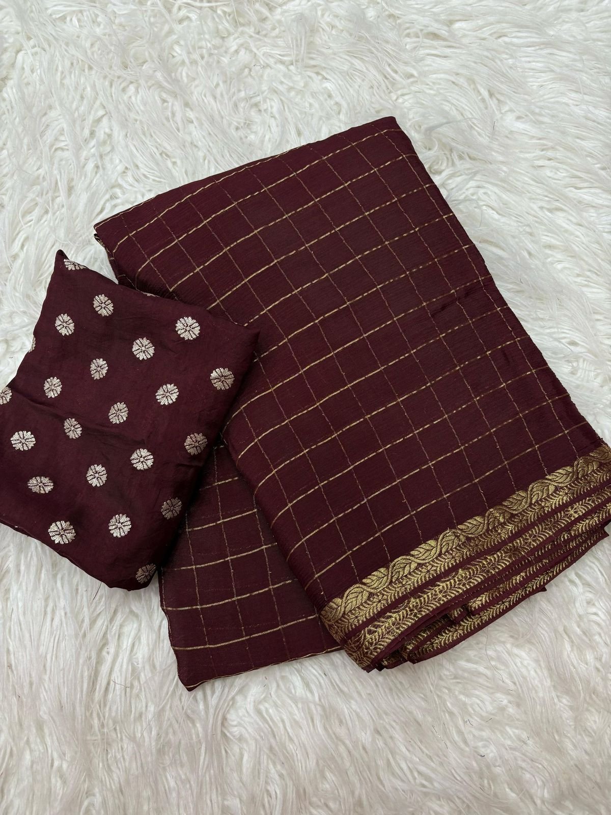 Quality – Pure viscose Chinon Chiffon blend Saree with zari chex and pattu border