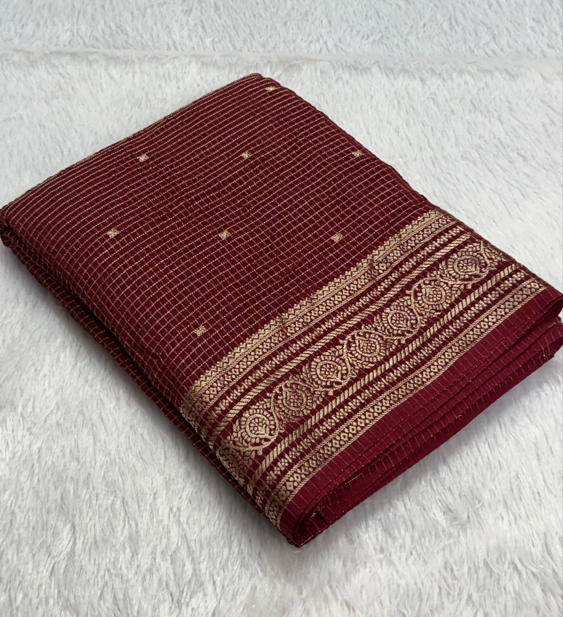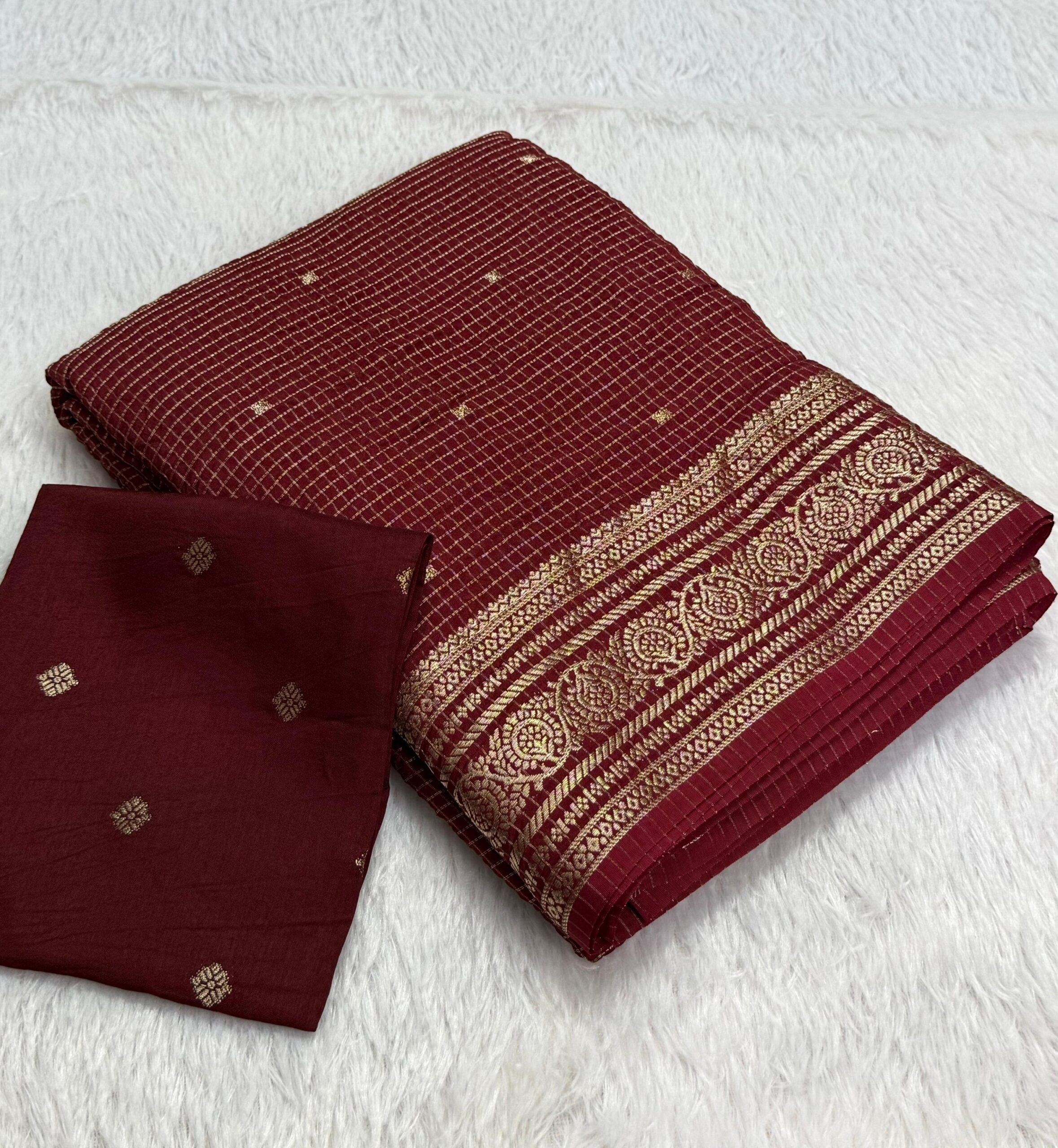 Pure viscose Russian chex saree with zari butti all over and zari border on both sides