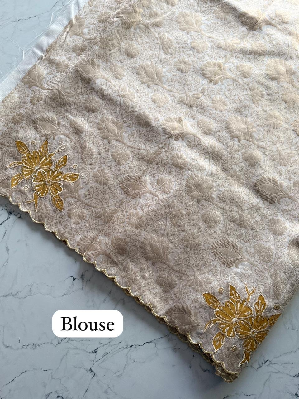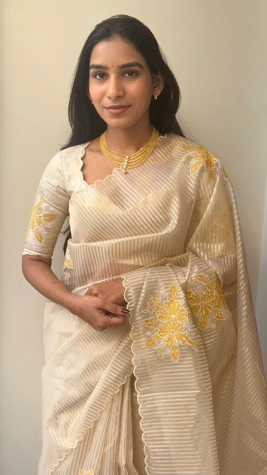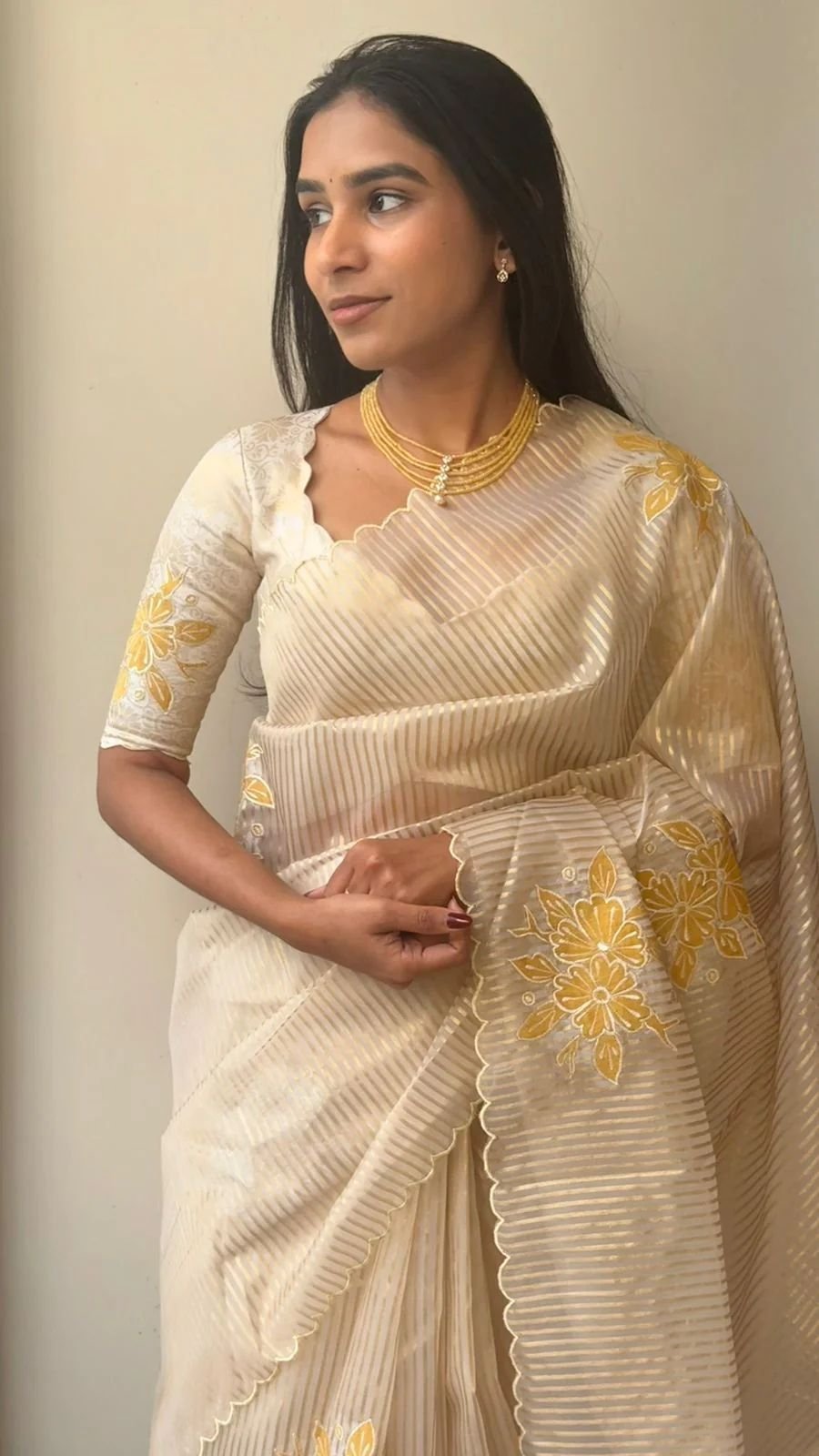 Primium Orgenza Saree With Zari Stripe And Appliqué Flower Work All over Saree