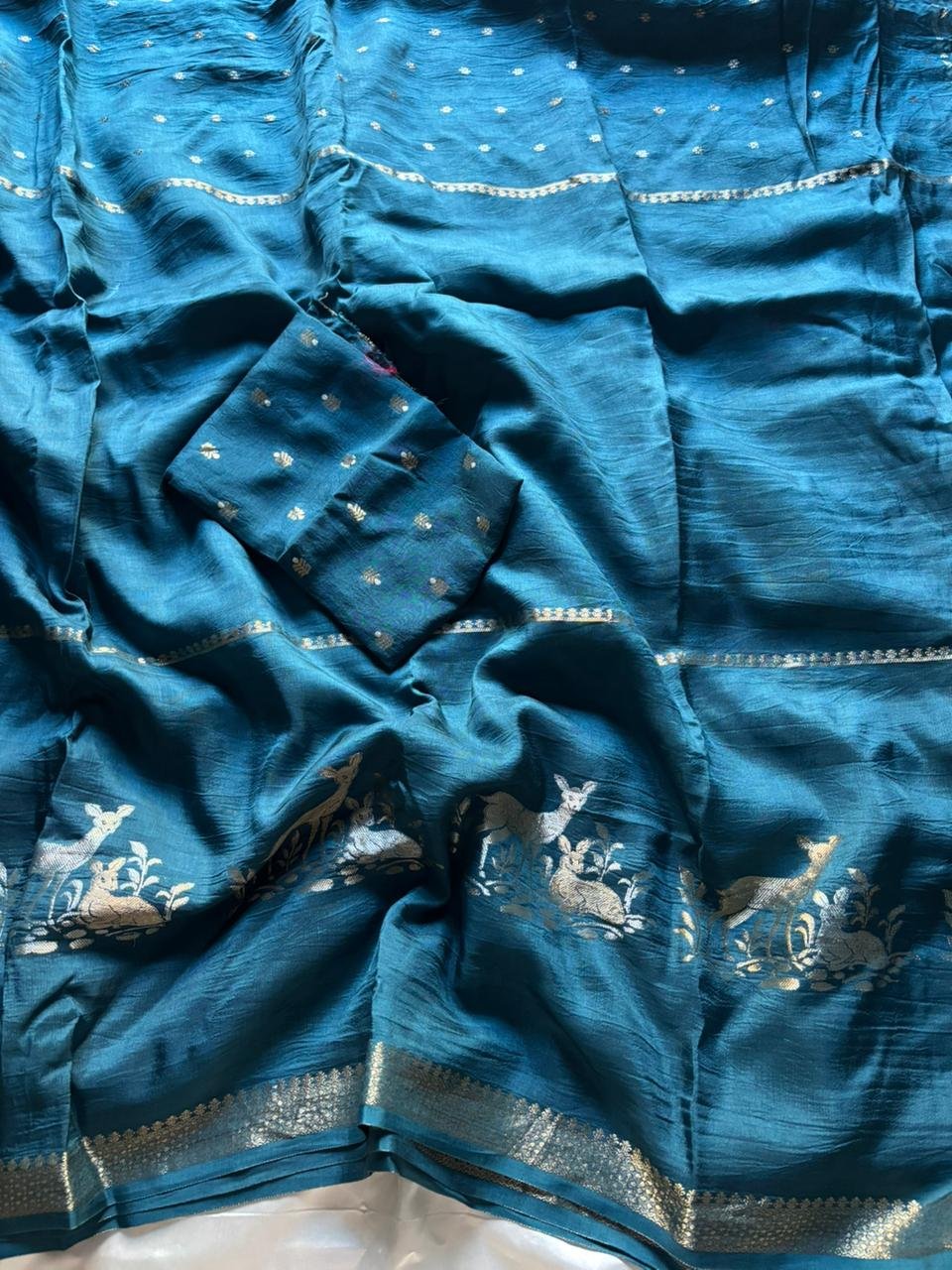 Embrace the elegance of our Pure Russian Khadi Viscose Saree, adorned with intricate Hiran (Deer) figures and stunning 2-type Zari Jacquard Patta. Paired with a beautiful Russian Butti blouse, this saree is a true masterpiece. 🦌✨ #ViscoseSaree #KhadiSaree #RussianKhadi #HiranSaree #ZariJacquard #ElegantSaree