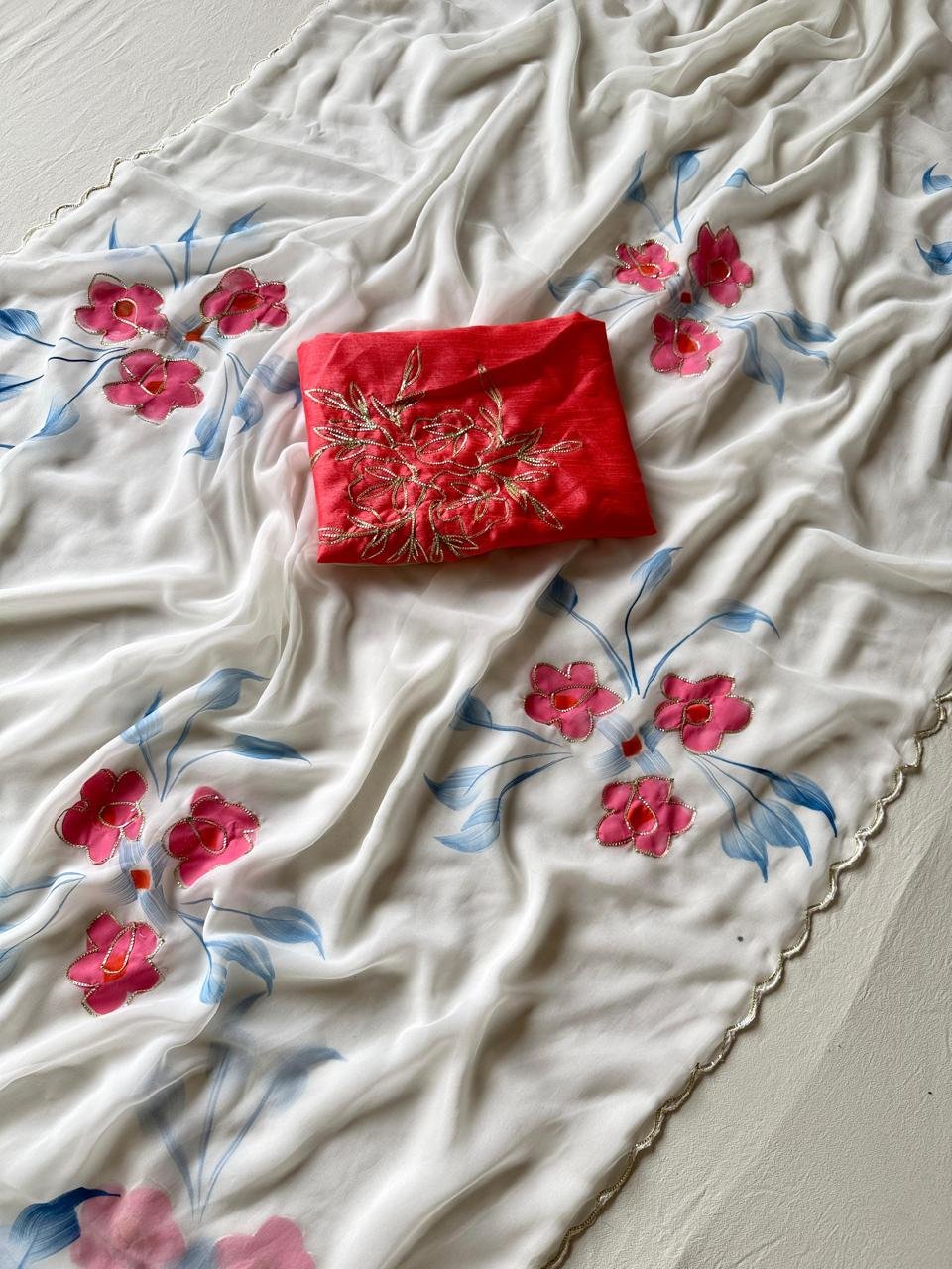 ▶️ *Fabric* – *Soft Georgette Fabric With Beautiful Floral Brush Print And Ribbon Work In Body And Cutwork Border With Contrast Art Silk Blouse👚*