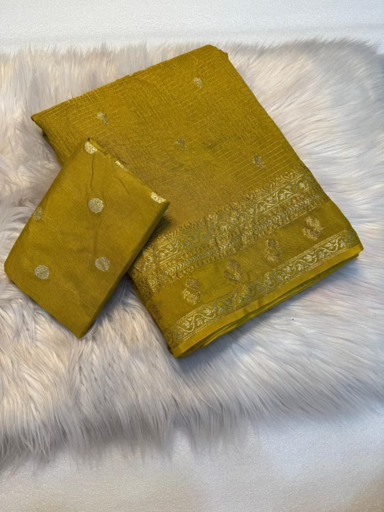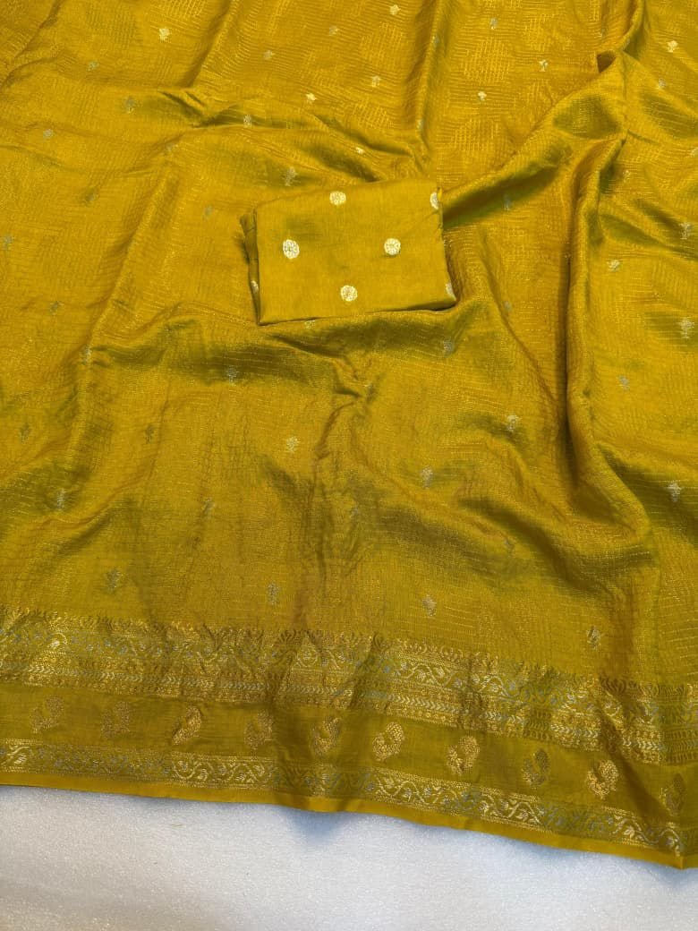 Introducing a pure viscose chinon chex saree, featuring an all-over zari butti design and a border woven with a golden and silver zari combination.
