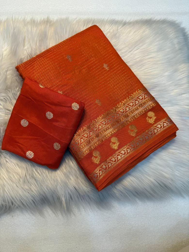 Introducing a pure viscose chinon chex saree, featuring an all-over zari butti design and a border woven with a golden and silver zari combination.