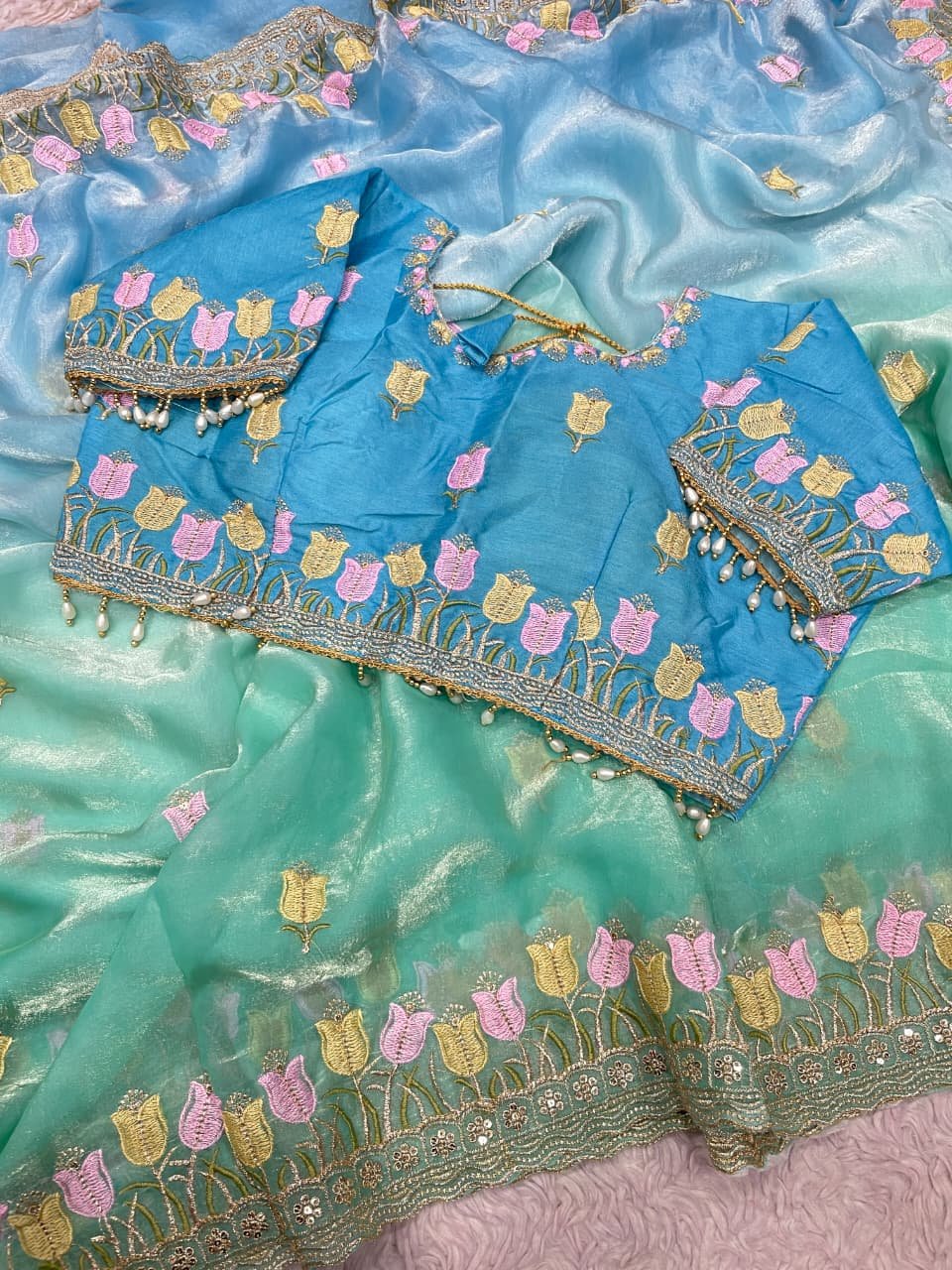 Pure soft fendy padding saree with embroidery work border with Jharkhand work touch up and buttis all over the saree and aarco.