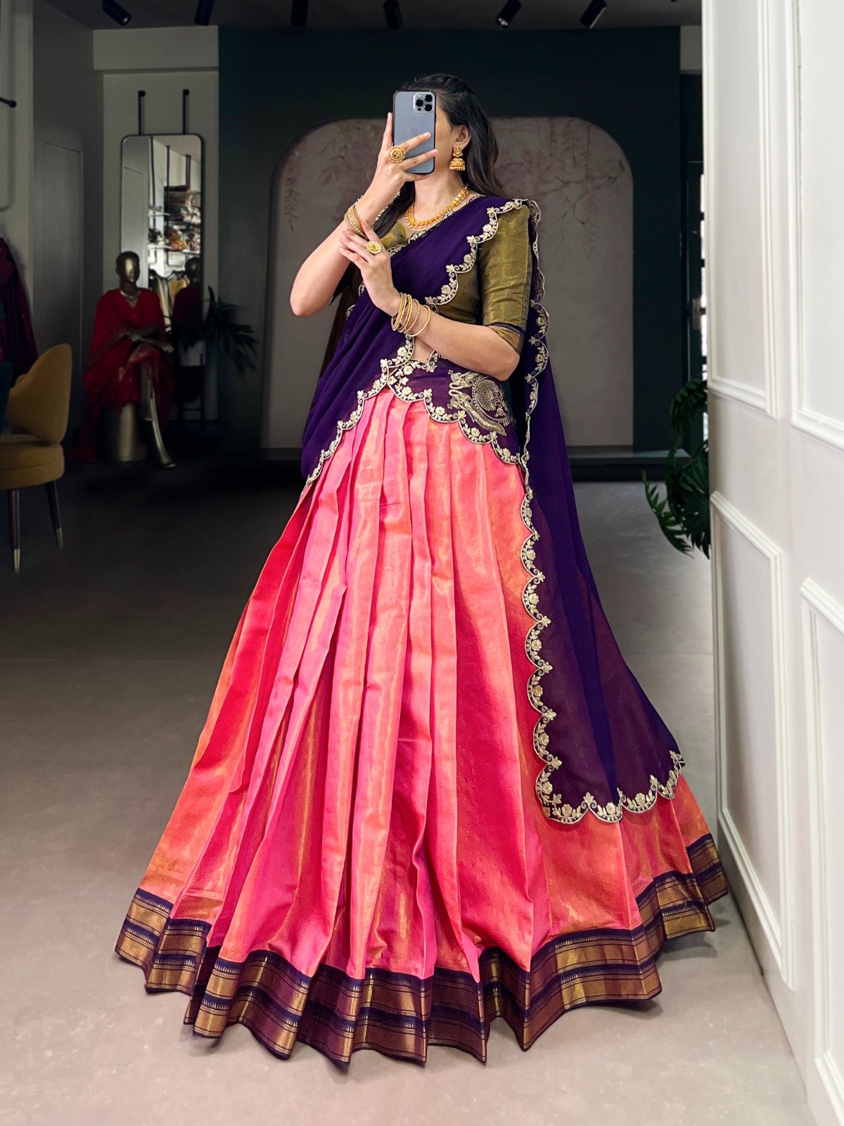 Elevate your special occasions with our Kanchipuram silk lehenga, meticulously crafted with intricate zari details to impart a regal aesthetic.