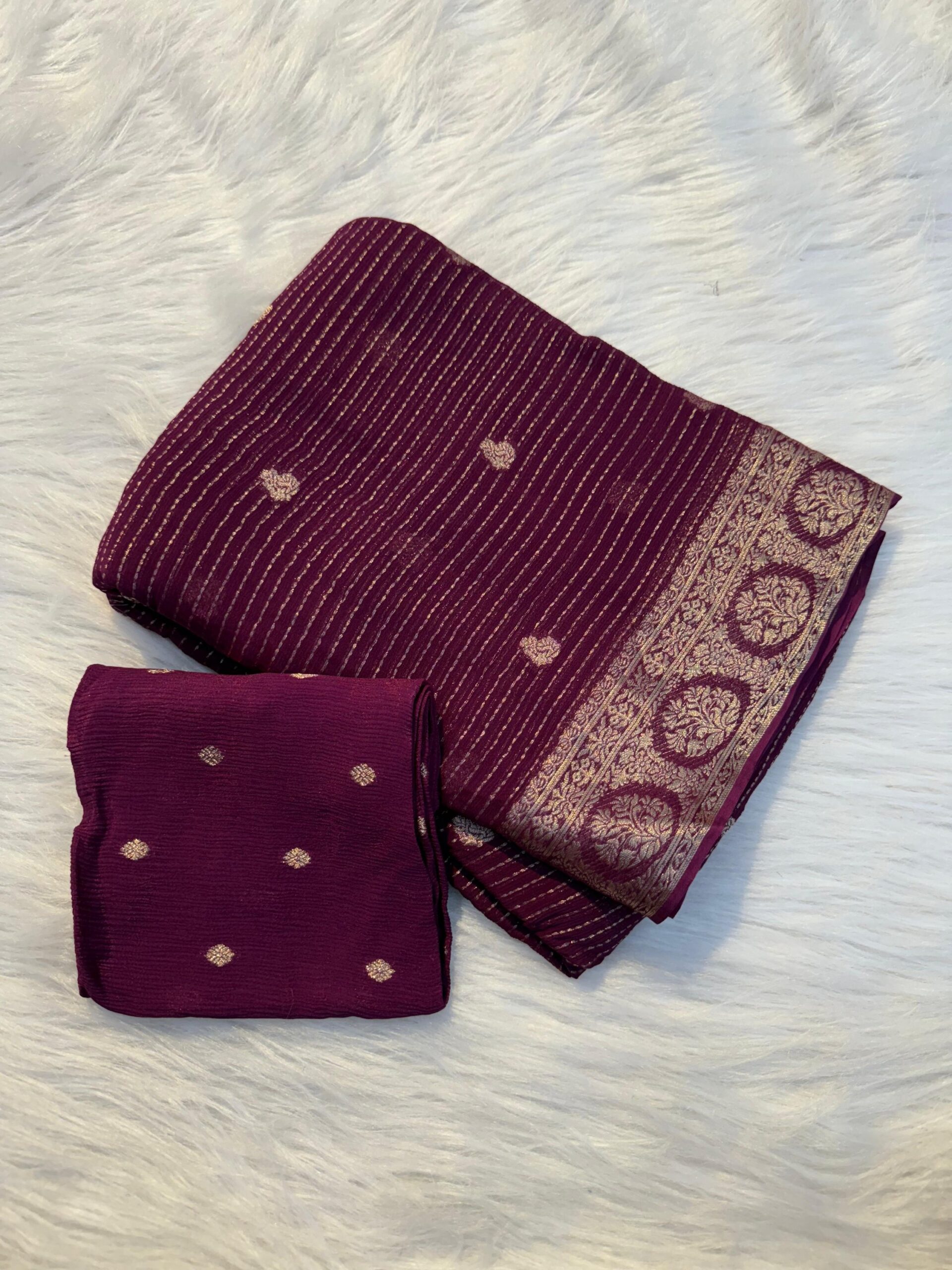 Fabric: Pure viscose soft Chinon, rich pallu with all-over lining with small butti with jari border on both sides.