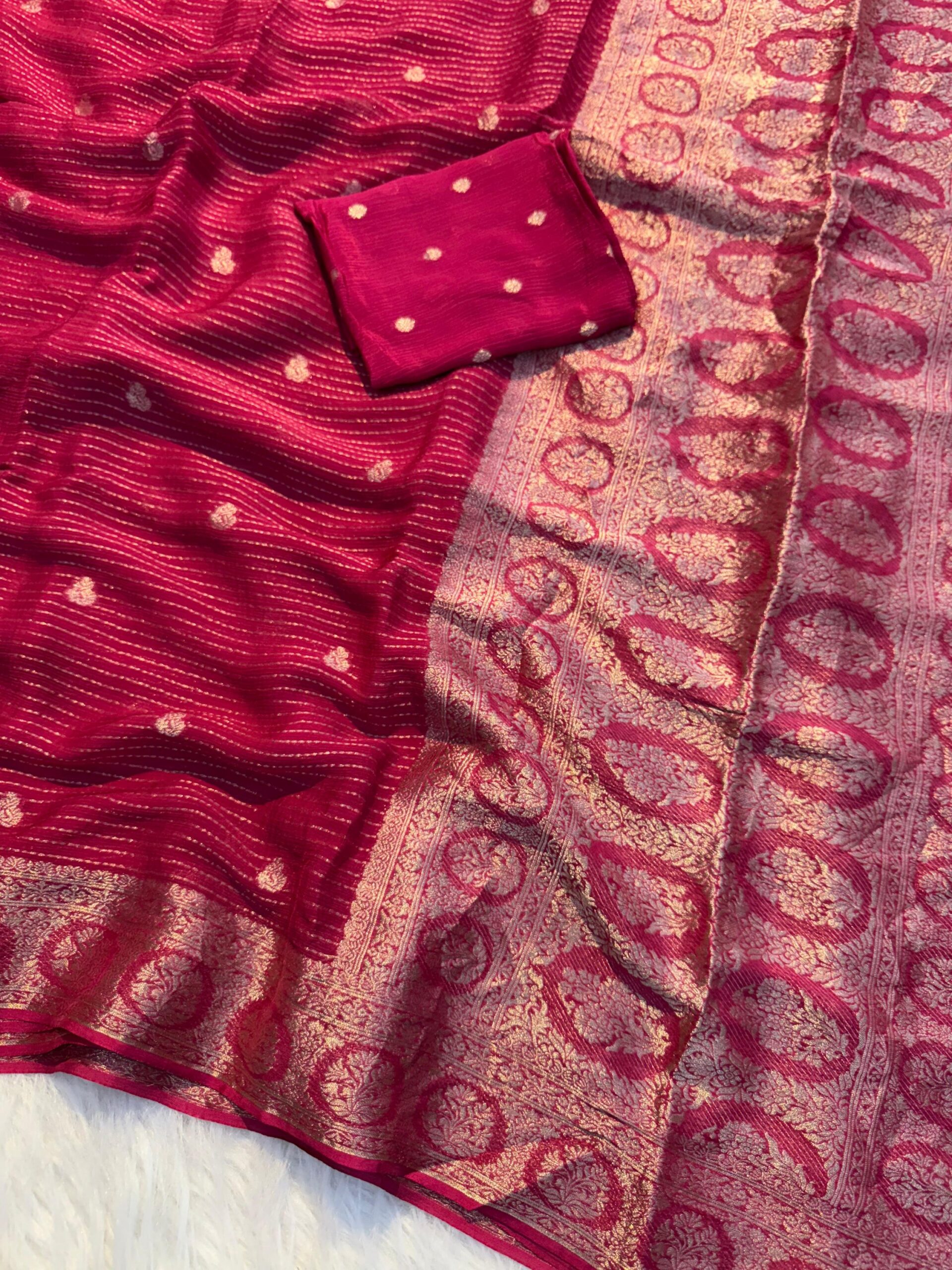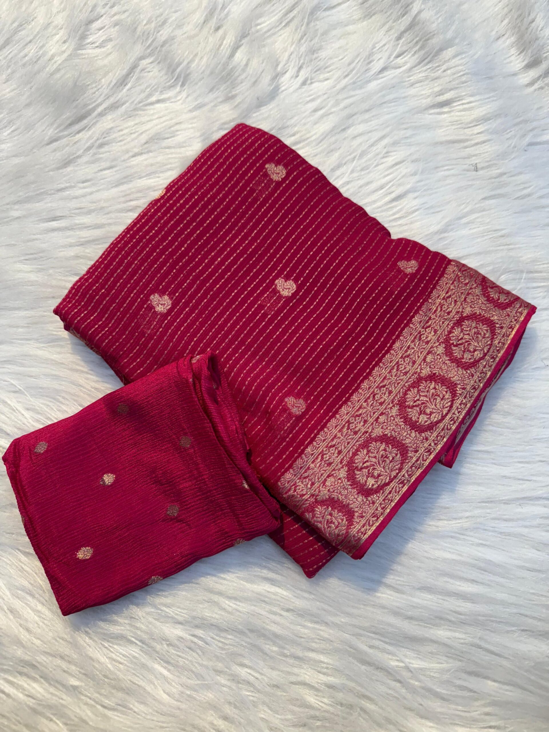 Fabric: Pure viscose soft Chinon, rich pallu with all-over lining with small butti with jari border on both sides.