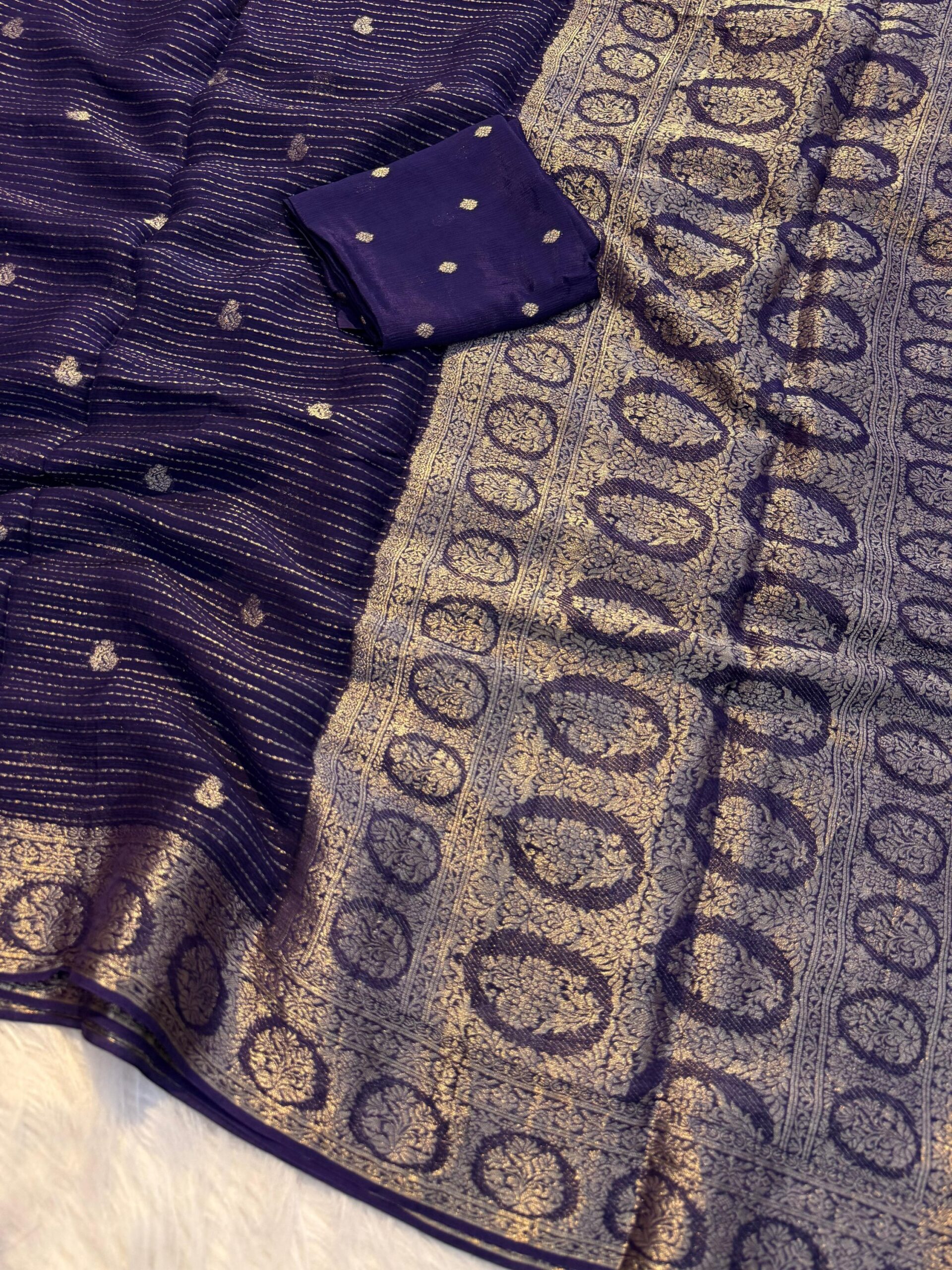 Fabric: Pure viscose soft Chinon, rich pallu with all-over lining with small butti with jari border on both sides.