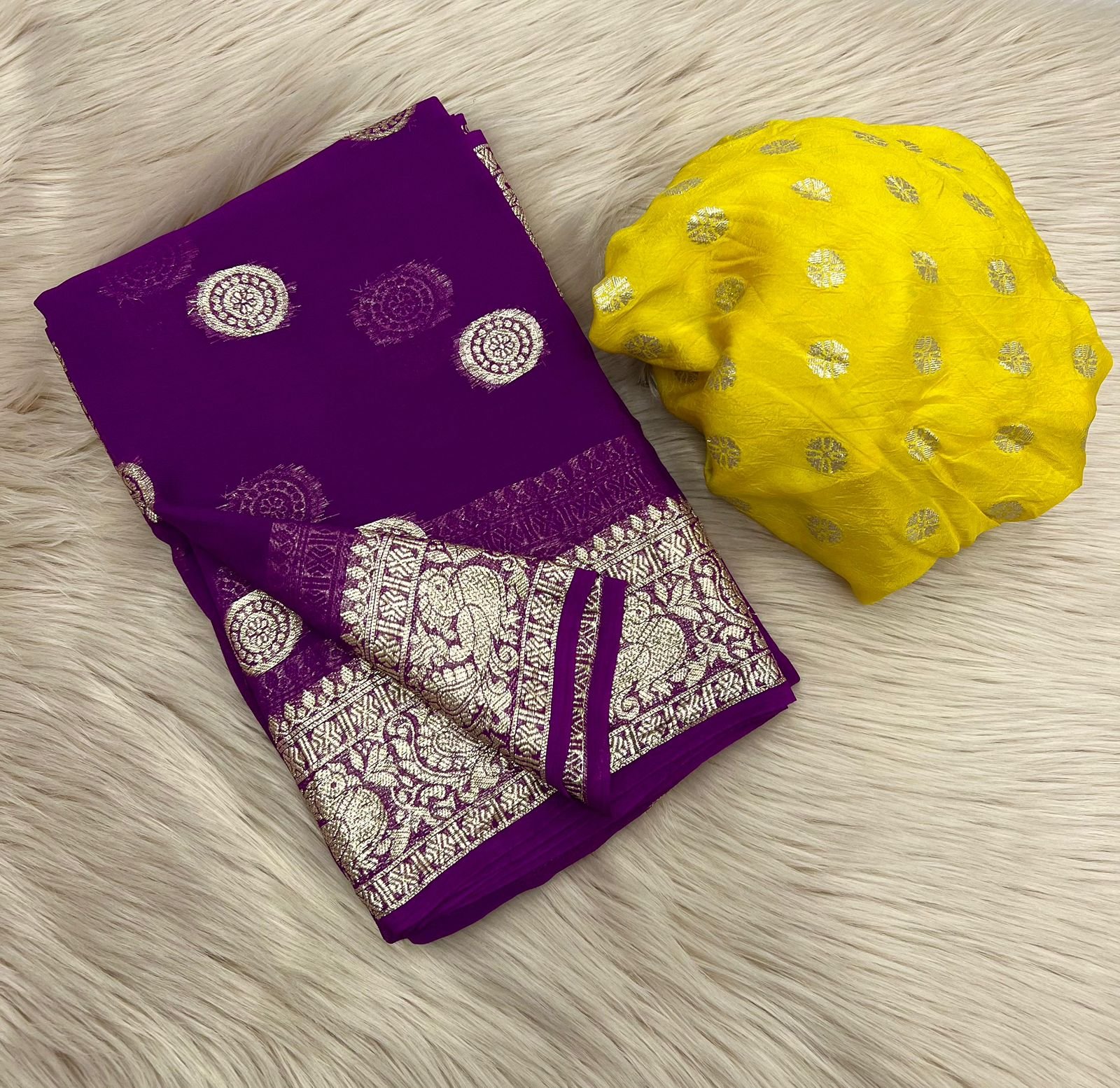 Each saree is paired with a contrasting Viscose Georgette Weaving Blouse.